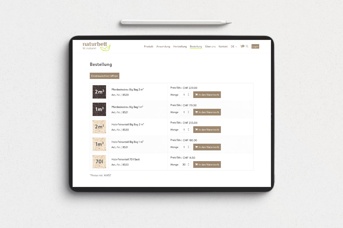 Die Naturbett® Pferdeeinstreu verbessert das Wohlbefinden von Pferden merklich. Zur einfacheren Bestellung wurde die bestehende Website mit einem Online-Shop erweitert.