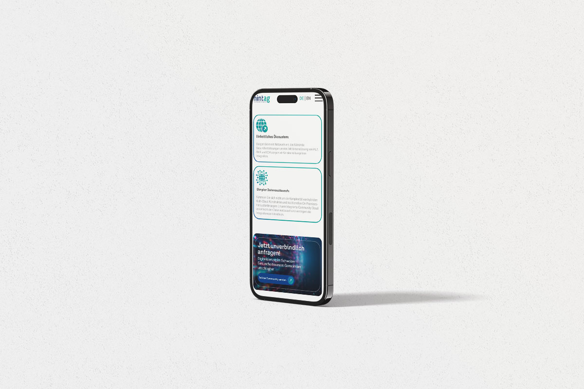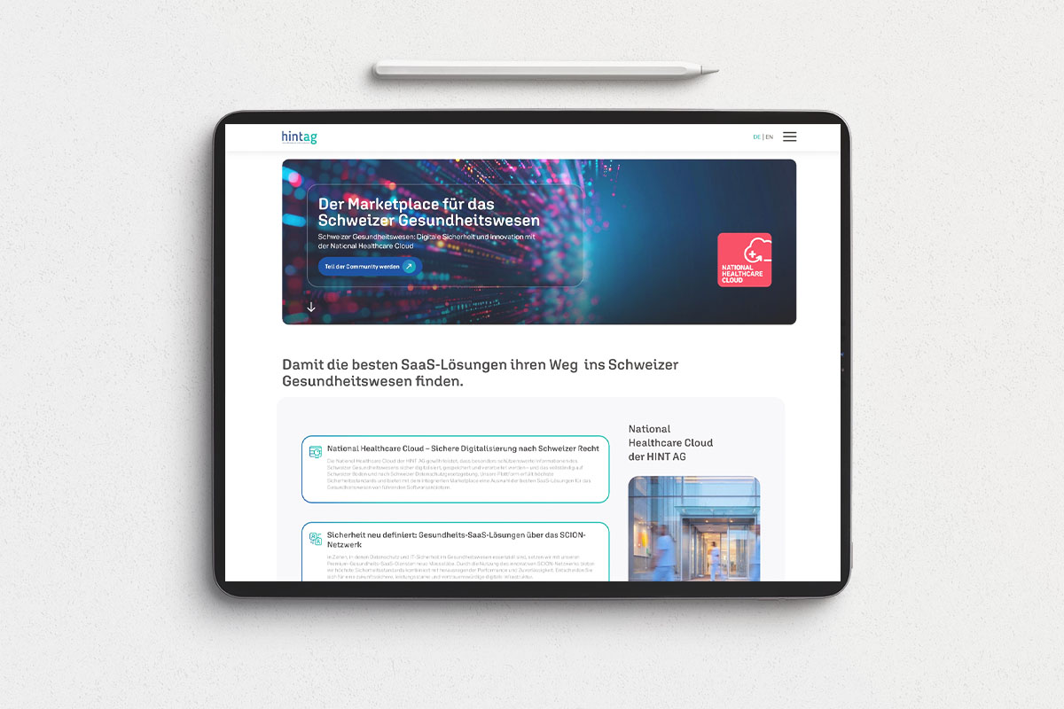 Für die National Healthcare Cloud der HINT AG haben wir den Webauftritt, von der visuellen Konzeption bis zur technischen Umsetzung auf einer eigenständigen Domain, entwickelt.